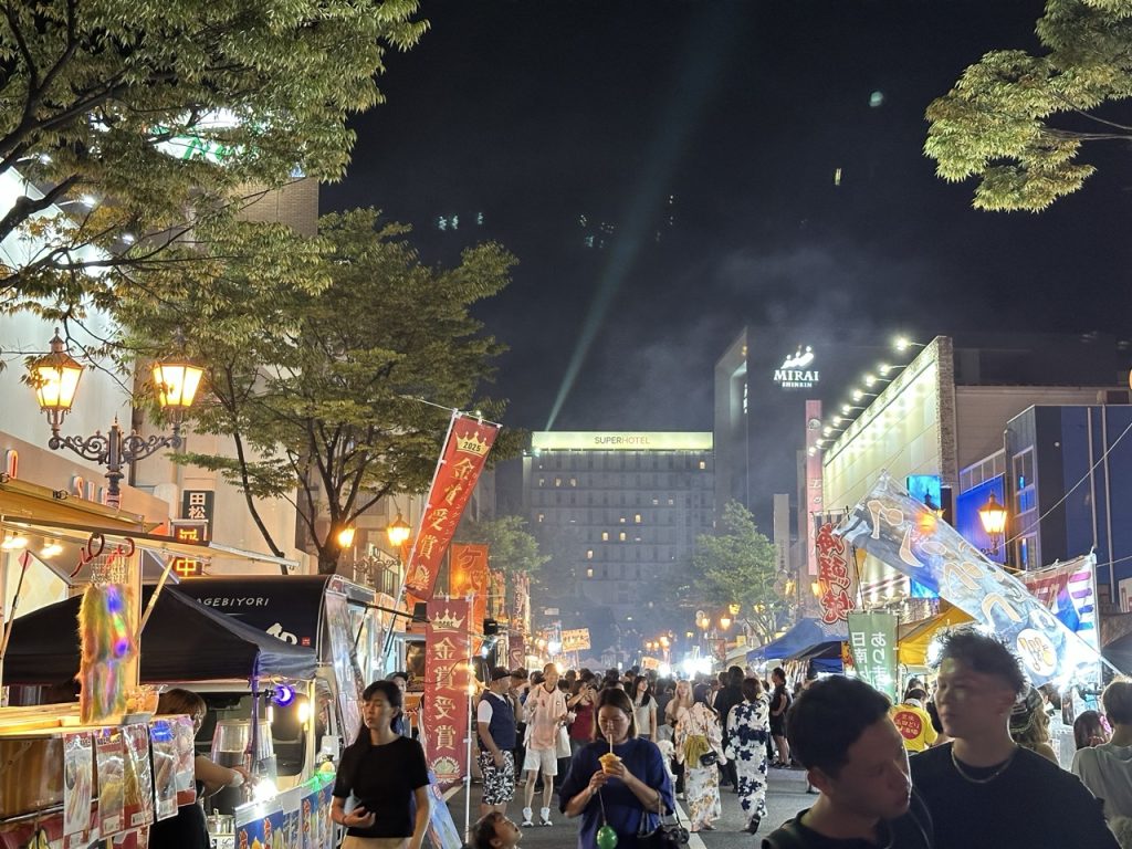 別府車站前通,正逢別府火之海祭納涼花火大會,街道上充滿人潮與攤販。(圖右,簡立喆提供)